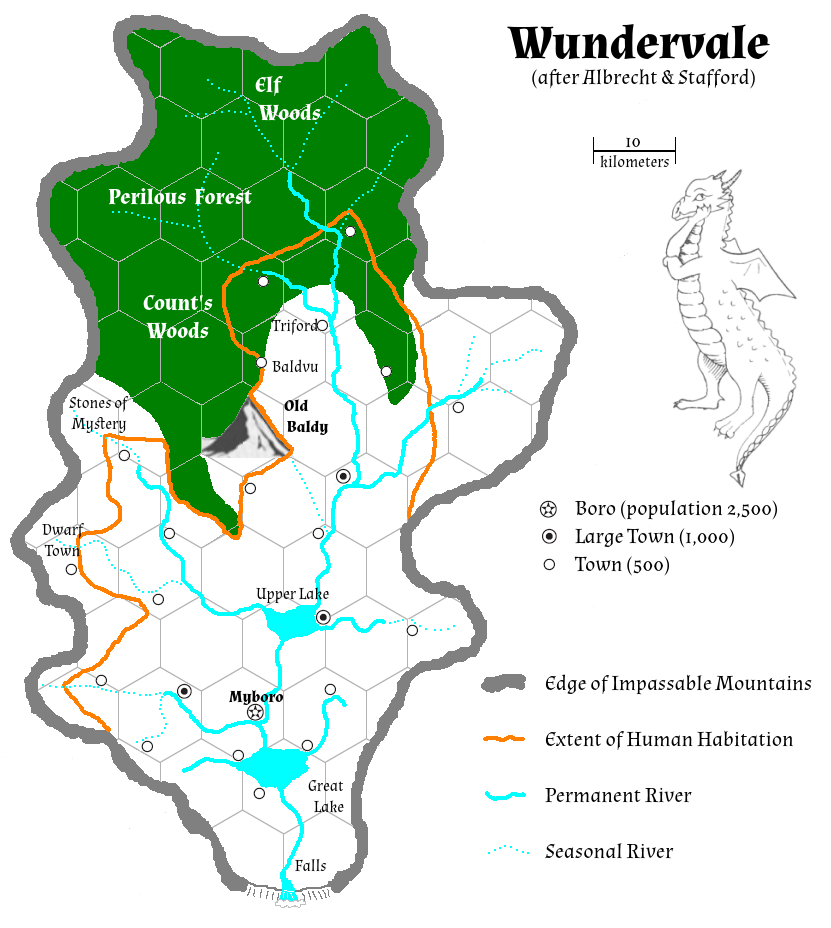 Along with a set of rules, The Adventurer's Handbook offers a setting called Wundervale. The map provided in the book is rather unsightly, so I was compelled to create a less unsightly map that I present above. (The map in the book shows “Elf Wood's.”)